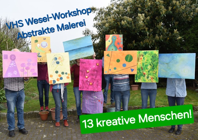 Im Nachklang der vhs-Exkursion zur Ausstellung Hilma af Klint und Wassily Kandinsky – Träume von der Zukunft in der Düsseldorfer Kunstsammlung, fand auf dem Kreativhof Lehmberg in Hamminkeln ein Workshop der abstrakten Acrylmalerei statt. Gemeinsam mit Kunsthistorikerin und Künstlerin Silke Noltenhans begann die grobe Einführung in Kandinskys Ansichten der modernen Kunsttheorie. Anschließend konnten die Teilnehmenden unter fachkundiger Anleitung eigene Werke anfertigen. Aufgrund der positiven Resonanz sind im nächsten Semester weitere Workshops geplant.